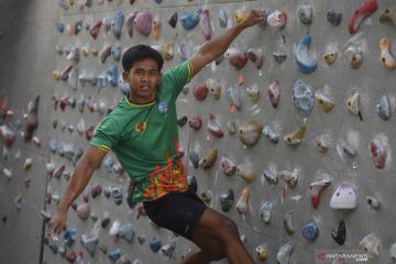 Atlet panjat tebing Jawa Timur Rahmad Adi Mulyono mengikuti latihan di Surabaya, Jawa Timur, Senin (13/9/2021). Panjat tebing merupakan salah satu cabang olahraga unggulan Jawa Timur dan Adi menjadi salah satu atlet panjat tebing unggulan yang diharapkan mampu meraih medali emas pada PON Papua. ANTARA FOTO/Zabur Karuru/wsj.