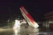 Sebuah bangunan SPBU roboh diterjang angin saat badai tropis Nicholas mulai memasuki wilayah Matagorda, Texas, AS, Senin (13/9/2021). ANTARA FOTO/Andrew Dubya/via REUTERS/foc.
