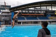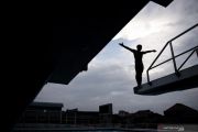 Siluet atlet loncat indah putra Jawa Barat Aryanto Saputra melakukan latihan rutin jelang pelaksanaan PON Papua di kolam renang UPI, Setiabudi, Bandung, Jawa Barat, Rabu (15/9/2021). Tim loncat indah Jawa Barat menurunkan tiga atletnya untuk bertanding di PON Papua dan menargetkan satu medali emas dan satu perak. ANTARA FOTO/M Agung Rajasa/hp.