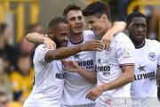 Pesepakbola Brentford Bryan Mbeumo (kiri) melakukan selebrasi bersama rekan-rekannya setelah berhasil mencetak gol ke gawang Wolverhampton Wanderers dalam laga pekan kelima Liga Inggris, di Stadion Molineux, Wolverhampton, Inggris, Sabtu (18/9/2021). Brentford mengalahkan Wolverhampton 2-0. ANTARA FOTO/Reuters-Tony Obrien/hp.