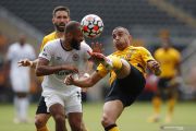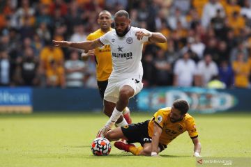 Pesepak bola Brentford Bryan Mbeumo (kiri) berupaya melewati penjagaan pesepak bola Wolverhampton Wanderers Joao Moutinho dalam laga pekan kelima Liga Inggris, di Stadion Molineux, Wolverhampton, Inggris, Sabtu (18/9/2021). Brentford mengalahkan Wolverhampton 2-0. ANTARA FOTO/Reuters-Andrew Couldridge /hp.
