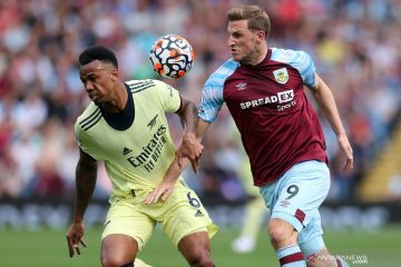 Pesepak bola Arsenal Gabriel (kiri) berebut bola dengan pesepak bola Burnley Chris Wood (kanan) dalam laga pekan kelima Liga Inggris, di Stadion Turf Moor, Burnley, Inggris, Sabtu (18/9/2021). HIngga babak pertama usai Arsenal unggul 1-0 atas lawannya. ANTARA FOTO/Reuters-Carl Recine /hp.
