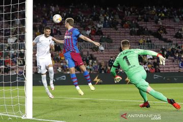 Pemain Granada Domingos Duarte (kiri) menyundul bola ke gawang Barcelona hingga mencetak gol saat laga lanjutan LaLiga di Stadion Camp Nou, Barcelona, Spanyol, Senin (20/9/2021). Barcelona gagal meraih poin penuh saat menjamu Granada usai ditahan imbang 1-1. ANTARA FOTO/REUTERS/Albert Gea/wsj.