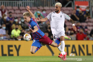 Pemain Barcelona Frankie de Jong (kiri) berebut bola dengan pemain Granada Monchu saat laga lanjutan LaLiga di Stadion Camp Nou, Barcelona, Spanyol, Senin (20/9/2021). Barcelona gagal meraih poin penuh saat menjamu Granada usai ditahan imbang 1-1. ANTARA FOTO/REUTERS/Albert Gea/wsj.