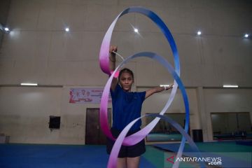 Atlet Senam Ritmik Sumatera Utara Thasya Selivya Valentine berlatih di Gedung Jepta Hutabarat, Medan, Sumatera Utara, Selasa (21/9/2021). Tim Senam Ritmik Sumatera Utara menurunkan dua atletnya untuk bertanding di PON Papua pada bulan Oktober mendatang dengan target medali emas. ANTARA FOTO/Fransisco Carolio/aww.
