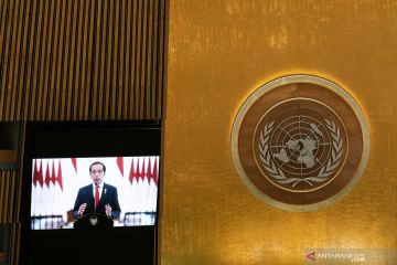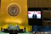 Layar monitor menayangkan rekaman pidato Presiden Joko Widodo di Sidang Umum ke-76 PBB di Kota New York, Amerika Serikat, Rabu (22/9/2021). ANTARA FOTO/Eduardo Munoz/Pool via REUTERS/wsj.