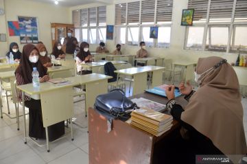Sejumlah murid berdoa sebelum memulai proses belajar mengajar di Sekolah Madrasyah Tsnawiyah Negeri (MTsN) Model, Banda Aceh, Aceh, Jumat, (24/9/2021). Pemerintah kembali mengizinkan sejumlah sekolah dari berbagai tingkatan pendidikan menggelar pembelajaran tatap muka terbatas dengan sistem pembagian waktu dan menerapkan protokol kesehatan secara ketat setelah Aceh keluar dari zona merah COVID-19. ANTARA FOTO/Ampelsa/foc.