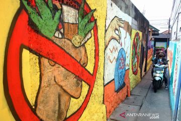 Pengendara motor melewati mural dengan tema anti narkoba di Gang Madrasah RW 01, Kelurahan Cikaret, Kota Bogor, Jawa Barat, Sabtu (25/9/2021). Mural di Kampung Tangguh Bersih dari Narkoba yang dicanangkan Polresta Bogor Kota di wilayah tersebut sebagai upaya edukasi dan sosialisasi kepada masyarakat untuk mencegah peredaran dan bahaya narkoba di Kota Bogor. ANTARA FOTO/Arif Firmansyah/rwa.