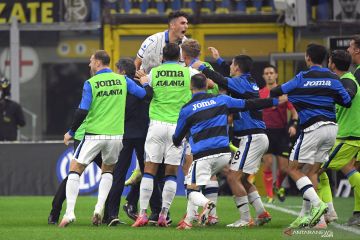 Pesepak bola Atalanta Roberto Piccoli melakukan selebrasi dengan rekan-rekannya setelah berhasil mencetak gol ke gawang Inte Milan dalam laga pekan keenam Liga Italia, di Stadion San Siro, Milan, Italia, Sabtu (25/9/2021). Atalanta berhasil menahan imbang Inter Milan 2-2. ANTARA FOTO/Reuters-Alberto Lingria/hp.