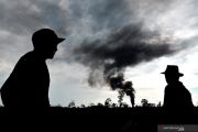 Warga melihat kepulan asap yang keluar dari sumur minyak ilegal yang terbakar di Bungku, Bajubang, Batanghari, Jambi, Minggu (26/9/2021). Memasuki hari ke-9, api masih membara di lokasi kebakaran. ANTARA FOTO/Wahdi Septiawan/foc.