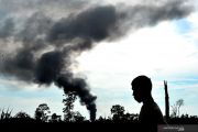 Warga melintas dengan latar belakang kepulan asap yang keluar dari sumur minyak ilegal yang terbakar di Bungku, Bajubang, Batanghari, Jambi, Minggu (26/9/2021). Memasuki hari ke-9, api masih membara di lokasi kebakaran. ANTARA FOTO/Wahdi Septiawan/foc.