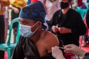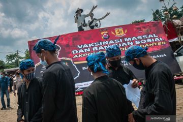 Petugas kesehatan menyutikkan vaksin COVID-19 kepada warga Suku Baduy Luar di Ciboleger, Lebak, Banten, Senin (27/9/2021). Vaksinasi COVID-19 yang diikuti sebanyak 34 warga Suku Baduy Luar tersebut dilakukan Polda Banten guna mempercepat pencapaian kekebalan komunal dengan menyasar Suku Baduy. ANTARA FOTO/Muhammad Bagus Khoirunas/hp.