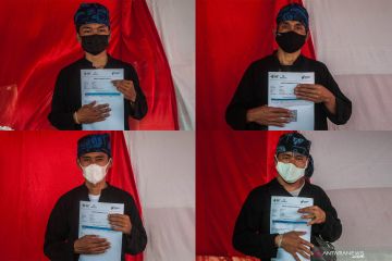 Foto kolase warga Suku Baduy Luar menunjukkan sertifikat vaksin COVID-19 usai mengikuti vaksinasi di Ciboleger, Lebak, Banten, Senin (27/9/2021).Vaksinasi COVID-19 yang diikuti sebanyak 34 warga Suku Baduy Luar tersebut dilakukan Polda Banten guna mempercepat pencapaian kekebalan komunal dengan menyasar Suku Baduy. ANTARA FOTO/Muhammad Bagus Khoirunas/hp.