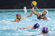Atlet polo air putri DKI Jakarta Ariel Dyah Cininta (kiri) berusaha menghalau lemparan bola dari atlet polo air putri Jawa Barat Hanna Firdaus saat pertandingan pada pertandingan Polo Air Putri PON Papua di Stadion Akuatik, Kampung Harapan, Kabupaten Jayapura, Papua, Senin (27/9/2021). Tim polo air putri DKI Jakarta mengalahkan tim polo air putri Jawa Barat dengan skor 10-7. ANTARA FOTO/M Agung Rajasa/hp.