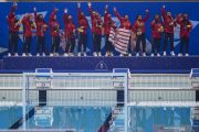Tim polo air putri DKI Jakarta merayakan kemenangan saat penyematan medali pada pertandingan Polo Air Putri PON Papua di Stadion Akuatik, Kampung Harapan, Kabupaten Jayapura, Papua, Senin (27/9/2021). Tim polo air putri DKI Jakarta menyumbang medali emas setelah mengalahkan tim polo air putri Jawa Barat dengan skor 10-7. ANTARA FOTO/M Agung Rajasa/hp.