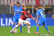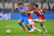 Pesepak bola AC Milan Brahim Diaz i(kanan) berebut bola dengan pesepak bola Atletico Madrid Geoffrey Kondogbia dalam laga Group B LIga Champions, di Stadion San Siro, Milan, Italia, Selasa (28/9/2021). Babak pertama berakhir AC Milan unggul 1-0 atas Atletico Madrid berkat gol yang di cetak Rafael Leao pada menit ke-20. ANTARA FOTO/Reuters--Daniele Mascolo/hp.