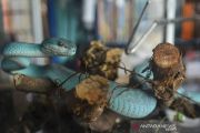 Seekor ular trimeresurus insularis berada di dalam kandang di Panyikiran, Kota Tasikmalaya, Jawa Barat, Rabu (29/9/2021). Pegiat alam terbuka Hira, membudidayakan ular berbisa untuk dilepasliarkan ke habitatnya agar menjaga keseimbangan ekosistem alam dan sebagai sarana edukasi kepada masyarakat. ANTARA FOTO/Adeng Bustomi/aww.
