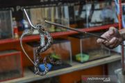 Pecinta hewan reftil menunjukan seekor ular rimeresurus albolabris di Panyikiran, Kota Tasikmalaya, Jawa Barat, Rabu (29/9/2021). Pegiat alam terbuka Hira, membudidayakan ular berbisa untuk dilepasliarkan ke habitatnya agar menjaga keseimbangan ekosistem alam dan sebagai sarana edukasi kepada masyarakat. ANTARA FOTO/Adeng Bustomi/aww.