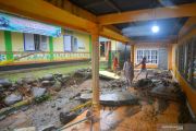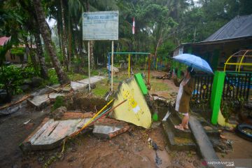 Anak-anak berjalan melewati reruntuhan pagar yang roboh usai diterjang banjir bandang, di Kuliek, Nagari Sungai Buluah Timur, Kabupaten Padangpariaman, Sumatera Barat, Kamis (30/9/2021). BPBD Padangpariaman mencatat, banjir bandang terjadi di daerah itu disebabkan hujan berintensitas tinggi sejak Rabu (29/9/2021), sementara di sejumlah titik di Padangpariaman terjadi banjir dan longsor. ANTARA FOTO/Iggoy el Fitra/foc.