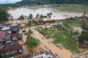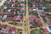 Foto udara banjir merendam permukiman di Nagari Kasang, Kabupaten Padangpariaman, Sumatera Barat, Kamis (30/9/2021). Data BPBD Padangpariaman, intensitas hujan tinggi sejak Rabu (29/9/2021) menyebabkan banjir merendam rumah warga di permukiman tersebut dengan tinggi air mencapai 100 cm. ANTARA FOTO/Iggoy el Fitra/foc.