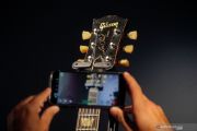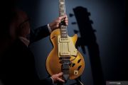 Seorang pengunjung memotret dengan kamera pintar gitar "Number One", model produksi paling awal dari gitar listrik Gibson Les Paul yang terkenal, dipajang di lelang Christie di New York City, Amerika Serikat, Kamis (30/19/2021). ANTARA FOTO/Reuters-Brendan McDermid/hp.
