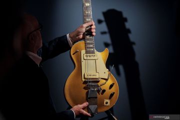 Gitar "Number One", model produksi paling awal dari gitar listrik Gibson Les Paul yang terkenal, dipajang di lelang Christie di New York City, Amerika Serikat, Kamis (30/19/2021). ANTARA FOTO/Reuters-Brendan McDermid/hp.