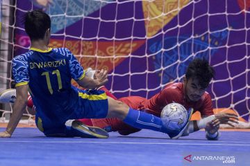 Atlet futsal Jawa Barat Dewa Rizki (kiri) berebut bola dengan penjaga gawang futsal Nusa Tenggara Barat Muhammad Wildan (kanan) saat bertanding pada semi final Futsal PON Papua di Gor SP 2, Kabupaten Mimika, Papua, Jumat (1/10/2021). Tim futsal Jawa Barat berhasil melaju ke final usai mengalahkan tim futsal Nusa Tenggara Barat dengan skor akhir 1-0. ANTARA FOTO/Novrian Arbi/foc.