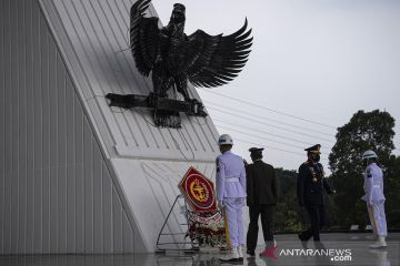 Panglima TNI Marsekal TNI Hadi Tjahjanto memberikan hormat saat ziarah nasional dan tabur bunga di Taman Makam Pahlawan Nasional Utama Kalibata, Jakarta Selatan, Senin (4/10/2021). Kegiatan tersebut merupakan rangkaian peringatan HUT ke-76 TNI tahun 2021. ANTARA FOTO/Sigid Kurniawan/rwa.