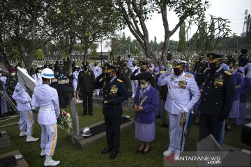 Panglima TNI Marsekal TNI Hadi Tjahjanto (keempat kanan) didampingi istri Nanny Hadi Tjahjanto (ketiga kanan), KSAL Laksamana TNI Yudo Margono (kedua kanan) dan KSAU Marsekal TNI Fadjar Prasetyo (kanan) memberikan hormat saat ziarah nasional dan tabur bunga di Taman Makam Pahlawan Nasional Utama Kalibata, Jakarta Selatan, Senin (4/10/2021). Kegiatan tersebut merupakan rangkaian peringatan HUT ke-76 TNI tahun 2021. ANTARA FOTO/Sigid Kurniawan/rwa.