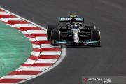 Pembalap Mercedes Valtteri Bottas memacu kendaraannya saat sesi latihan Formula One F1 Grand Prix Turki, di Sirkuit Istanbul Park, Istanbul, Turki, Jumat (8/10/2021). ANTARA FOTO/Reuters-Murad Sezer/hp.