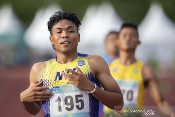 Pelari Nusa Tenggara Barat Lalu Muhammad Zohri beradu cepat dengan pelari-pelari lainnya dalam final lari 200 meter putra PON Papua di Stadion Atletik Mimika Sport Center, Kabupaten Mimika, Papua, Senin (11/10/2021). Lalu Zohri meraih medali emas, sementara pelari Kalimantan Tengah Eko Rimbawan meraih medali perak dan pelari Bali I Dewa made Mudiyasa meraih medali perunggu. ANTARA FOTO/Aditya Pradana Putra/aww.