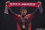 Karateka Bali I Kadek Krisna Dwi menunjukkan medali emas yang diperoleh dari karate nomor kumite putra -60 kg PON Papua di Jayapura, Papua, Rabu (13/10/2021). ANTARA FOTO/Akbar Nugroho Gumay/hp.