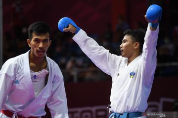 Karateka Bali I Kadek Krisna Dwi (kanan) meluapkan kegembiraan usai meraih poin saat melawan karateka Sumatera Barat Millio Oner dalam final karate kumite putra -60 kg PON Papua di Jayapura, Papua, Rabu (13/10/2021). I Kadek berhasil memastikan medali emas setelah menang 4-1. ANTARA FOTO/Akbar Nugroho Gumay/hp.