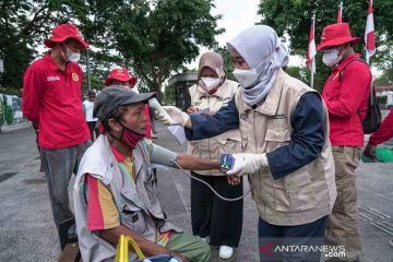Petugas memeriksa suhu tubuh seorang pedagang sebelum memberikan vaksin saat pelaksanaan vaksinasi jemput bola di kawasan Malioboro, Yogyakarta, Kamis (14/10/2021). Vaksinasi yang digelar oleh Badan Inteligen Negara (BIN) ditargetkan untuk para pedagang, tukang becak dan kusir andong di kawasan wisata Malioboro. ANTARA FOTO/Hendra Nurdiyansyah/rwa.