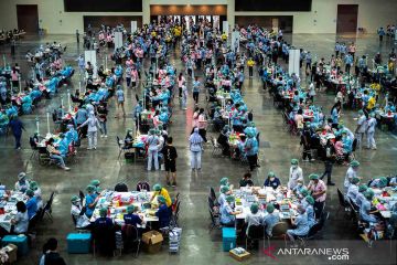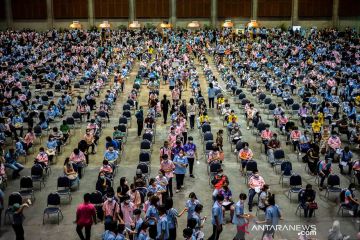 Siswa sekolah menengah antara usia 12-17 antre untuk mendapatkan vaksinasi Pfizer-BioNTech COVID-19 di aula konvensi, pinggiran Bangkok, Thailand, Jumat (15/10/2021). Thailand membuka kembali sekolah pada bulan November mendatang. ANTARA FOTO/ REUTERS/Athit Perawongmetha/rwa.