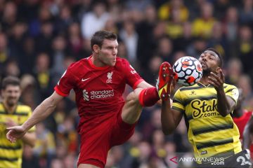 Pemain Liverpool James Milner berebut bola dengan pemain Watford Emmanuel Dennis dalam laga lanjutan Liga Inggris di Vicarage Road, Watford, Inggris, Sabtu (16/10/2021). Liverpool menang telak 5-0 dalam laga itu. ANTARA FOTO/Action Images via Reuters/Andrew Couldridge/foc.