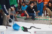 Warga memperagakan cara menangkap ular dengan bimbingan dan pengawasan Sahabat Reptil Bekasi di Perumahan Panjibuwono, Babelan, Kabupaten Bekasi, Jawa Barat, Sabtu (16/10/2021). Kegiatan tersebut bertujuan mengedukasi warga dan anak-anak untuk mengenal berbagai jenis ular dan bagaimana cara memberikan pertolongan pertama ketika digigit ular serta cara yang aman menangkapnya. ANTARA FOTO/Suwandy/pras.