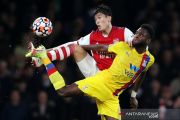 Pesepak bola Arsenal Takehiro Tomiyasu (belakang) berebut bola dengan pesepak bola Crystal Palace Odsonne Edouard (depan) dalam laga pekan kedelapan Liga Inggris, di Stadion Emirates, London, Inggris, Senin (18/10/2021). Crystal Palace berhasil menahan imbang Arsenal 2-2. ANTARA FOTO/Reuters--Peter Cziborra/hp.