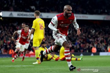 Pesepak bola Arsenal Alexandre Lacazette melakukan selebrasi setelah mencetak gol ke gawang Crystal Palace dalam laga pekan kedelapan Liga Inggris, di Stadion Emirates, London, Inggris, Senin (18/10/2021). Crystal Palace berhasil menahan imbang Arsenal 2-2. ANTARA FOTO/Reuters--Hannah Mckay /hp.