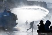 Para demonstran bentrok dengan polisi anti huru hara saat aksi unjuk rasa menentang pemerintah Chili pada peringatan kedua protes dan kerusuhan yang mengguncang negara itu pada 2019, di Valparaiso, Chili , Senin (18/10/2021). ANTARA FOTO/Reuters-Rodrigo Garrido/hp.
