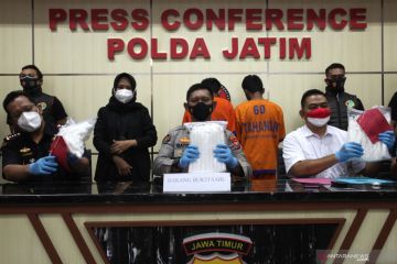 Polisi menunjukkan tersangka serta barang bukti saat ungkap kasus peredaran narkoba di Polda Jawa Timur, Surabaya, Jawa Timur, Selasa (19/10/2021). Ditresnarkoba Polda Jawa Timur bersama KPPBC Tipe Madya Pabean Tanjung Perak mengamankan kiriman tiga paket berisi sabu dengan berat total enam kilogram dan menangkap dua tersangka LK (30) serta ZN (28) yang diduga penerima salah satu paket berisi sabu seberat dua kilogram itu, sedangkan dua paket lainnya yang berisi sabu seberat empat kilogram masih dalam penyelidikan pihak kepolisian. ANTARA FOTO/Didik Suhartono/hp.