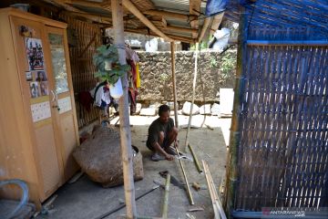 Warga menyiapkan bambu untuk dijadikan rangka hunian sementara di kawasan Banjar Darmaji, Desa Ban, Karangasem, Bali, Rabu (20/10/2021). Warga setempat yang tempat tinggalnya mengalami kerusakan akibat bencana gempa bumi 4,8 SR Karangasem Bali mulai membangun tempat hunian sementara dengan memanfaatkan sisa-sisa material seperti bambu dan kayu dari runtuhan rumah mereka serta menggunakan bantuan terpal yang diberikan warga. ANTARA FOTO/Fikri Yusuf/hp.