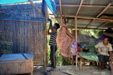 Warga membangun hunian sementara dari bambu di kawasan Banjar Darmaji, Desa Ban, Karangasem, Bali, Rabu (20/10/2021). Warga setempat yang tempat tinggalnya mengalami kerusakan akibat bencana gempa bumi 4,8 SR Karangasem Bali mulai membangun tempat hunian sementara dengan memanfaatkan sisa-sisa material seperti bambu dan kayu dari runtuhan rumah mereka serta menggunakan bantuan terpal yang diberikan warga. ANTARA FOTO/Fikri Yusuf/hp.