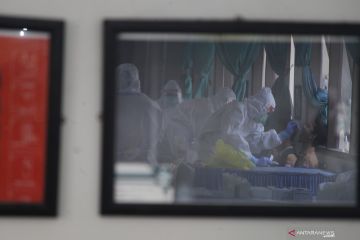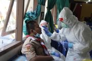 Petugas kesehatan melakukan tes usap PCR kepada siswa di SMP Negeri 8 Solo, Jawa Tengah, Jumat (22/10/2021). Tes usap yang diikuti 310 siswa 53 guru dan sejumlah karyawan serta mahasiswa magang sekolah setempat dilakukan sebagai upaya pelacakan menyusul terkonfirmasinya 11 siswa positif COVID-19. ANTARAFOTO/Maulana Surya/wsj.