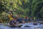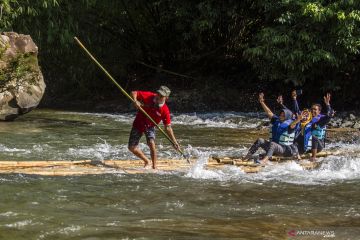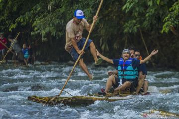 Wisatawan menaiki bamboo rafting (rakit bambu) di Sungai Amandit, Kecamatan Loksado, Kabupaten Hulu Sungai Selatan, Kalimantan Selatan, Sabtu (23/10/2021). Wisata arung jeram menggunakan rakit bambu yang menawarkan asrinya hutan Pegunungan Meratus serta merasakan sensasi menyusuri Sungai Amandit berarus deras tersebut menjadi daya tarik wisata di Kalimantan Selatan. ANTARA FOTO/Bayu Pratama S/wsj.