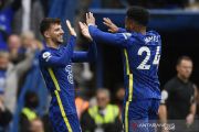 Pesepak bola Chelsea Mason Mount (kiri) melakukan selebrasi dengan rekannya Reece James setelah mencetak gol ke gawang Norwich City dalam laga pekan kesembilan liga Inggris, di Stadion Stamford Bridge, London, Inggris, Sabtu (23/10/2021). Chelsea membantai Norwich 7 gol tanpa balas. ANTARA FOTO/Reuters-Tony Obrien/hp.