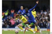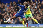 Pesepak bola Chelsea Reece James (kiri) berebut bola dengan pesepak bola Norwich City Brandon Williams dalam laga pekan kesembilan liga Inggris, di Stadion Stamford Bridge, London, Inggris, Sabtu (23/10/2021). Chelsea membantai Norwich 7 gol tanpa balas. ANTARA FOTO/Reuters-Andrew Boyers n/hp.
