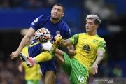 Pesepak bola Norwich City Josh Sargent (kiri) berebut bola dengan pesepak bola Chelsea Antonio Rudiger (kanan) dalam laga pekan kesembilan liga Inggris, di Stadion Stamford Bridge, London, Inggris, Sabtu (23/10/2021). Chelsea membantai Norwich 7 gol tanpa balas. ANTARA FOTO/Reuters-Tony Obrien/hp.