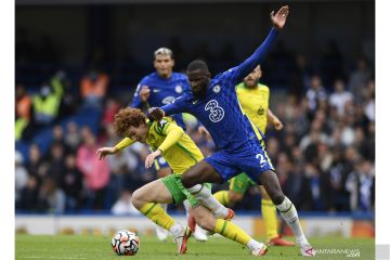 Pesepak bola Norwich City Mathias Normann (kanan) berebut bola dengan pesepak bola Chelsea Mateo Kovacic dalam laga pekan kesembilan liga Inggris, di Stadion Stamford Bridge, London, Inggris, Sabtu (23/10/2021). Chelsea membantai Norwich 7 gol tanpa balas. ANTARA FOTO/Reuters-Tony Obrien/hp.