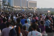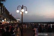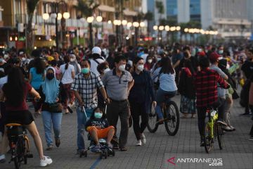 Pengunjung memadati kawasan Pantai Maju di Jakarta, Minggu (24/10/2021). Pantai Maju menjadi salah satu lokasi yang dijadikan tempat wisata warga Jakarta dan sekitarnya karena ditunjang fasilitas jalur Jalan Sehat dan Sepeda Santai (Jalasena) serta pemandangan teluk Jakarta. ANTARA FOTO/Hafidz Mubarak A/rwa.